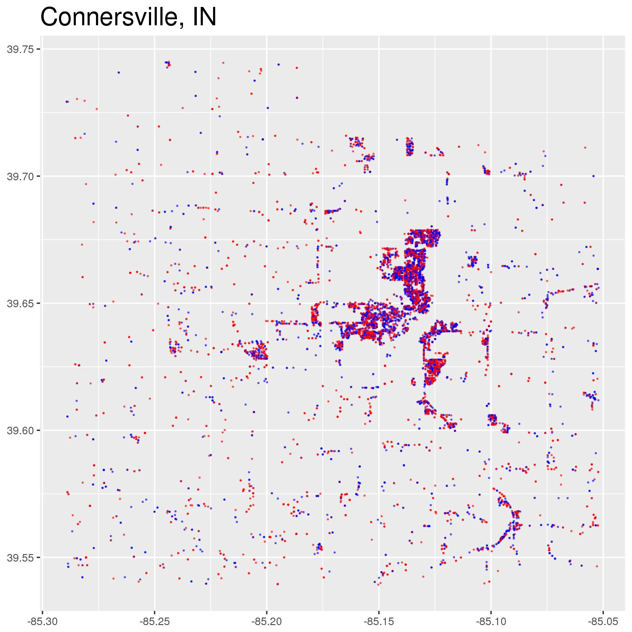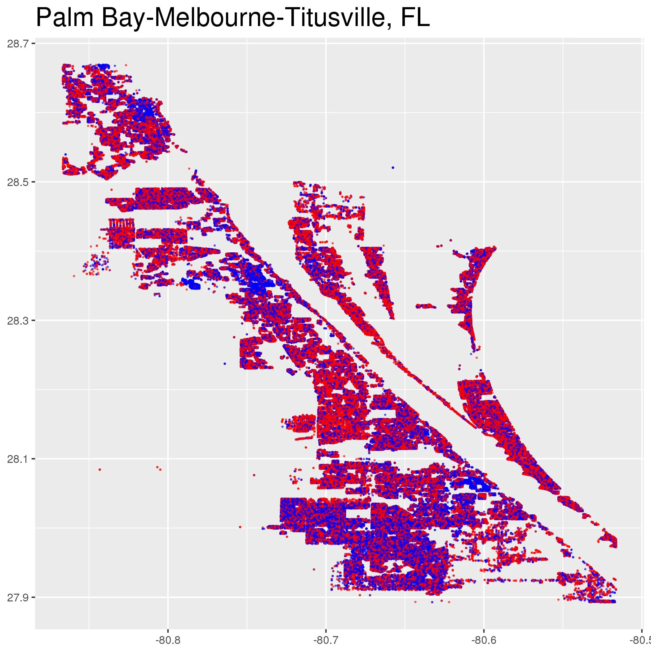 Below are maps of the exact location of every registered Democrat and Republican in every metropolitan area in the United States. The maps were created by Ryan Enos and Jacob Brown using data from L2 as part of the Partisan Segregation Project (technical details).